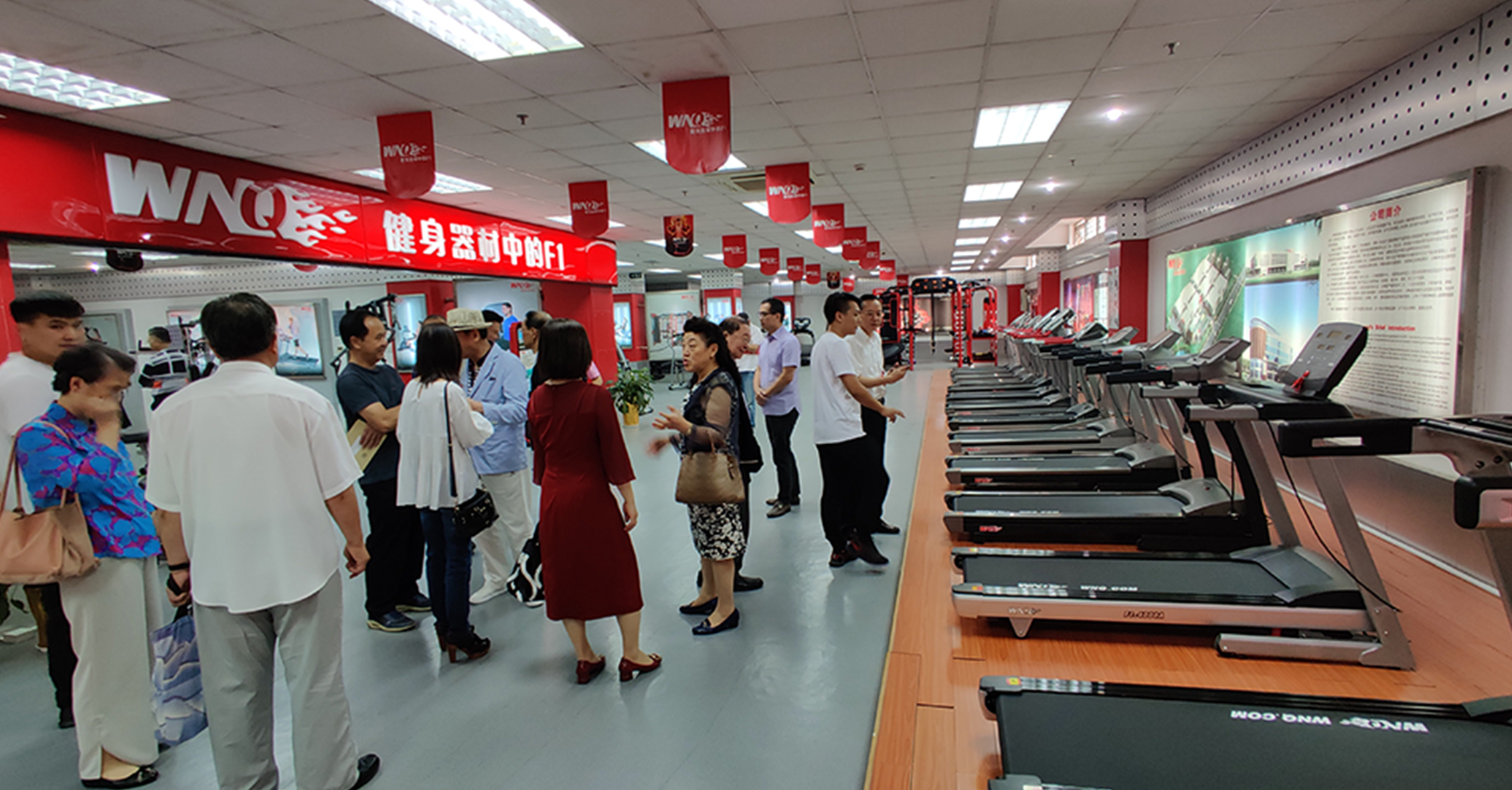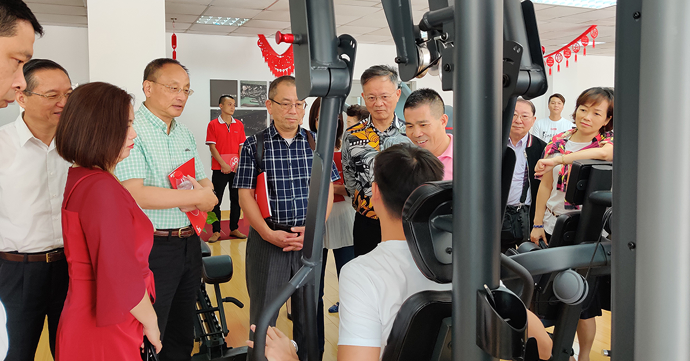 首先,来宾一行参观考察了谈求吧的文化长廊,对我司的发展历程、企业文化、企业特色等方面进行初步了解。在参观一楼与负一楼展厅过程中,来宾一行对谈求吧种类齐全的健身器材表现出浓厚的兴趣。